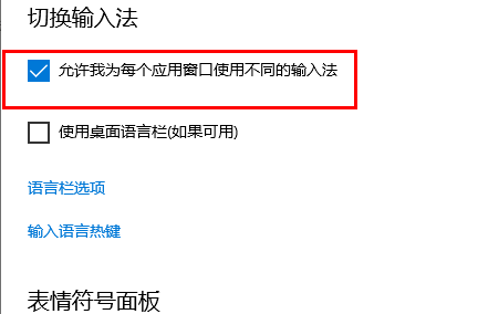 4. 在切换输入法中,勾选“允许我为每个应用窗口使用不同的输入法”即可。
